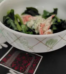 ツルムラサキ➕️カニカマきゅうり瓶マヨネーズで。 当選した30周年キユーピーちゃん器に。