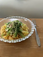 1人のランチにたまに冷凍パスタを食べます。でも栄養面と、ボリューム不足が玉に瑕…。そこで先日はコク旨アイオリ味マヨで炒めた壬生菜と榎茸をトッピングしてみました!コク旨アイオリマヨが、パスタにピッタリ!冷凍パスタがグレードアップしました♪(フォークは、以前Qummyさんのセットでゲットしたお気に入りの