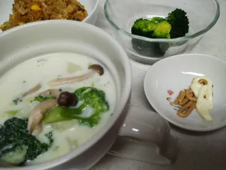 ブロッコリーサラダ(キユーピーハーフ+世界マヨ しびれ麻辣味を付けて) 野菜スープ(キユーピー3分クッキング野菜をたべよう!チャウダーの素 使用) じゃが芋も入れてホクホク温まりました チャーハン(冷凍)