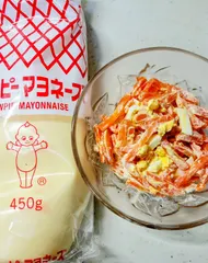 そんなときに作るのが、マヨサラダ。野菜切って和えるだけ、だけれど。きょうはキャベツと玉ねぎ、それにニンジン。マヨで混ぜたらちっちゃいトマトを置いて。それだけでできちゃうんだから、マヨネーズは便利。わたしの友だちだと思うな。