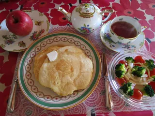 ホットケーキの朝ごはん 朝起きたら、食パンがなかったので・・・ホットケーキを焼きました。牛乳もないので、ホットケーキミックス+卵二つ+マヨネーズ+お水😅 出来は、適当でしたので、お正月らしく、おしゃれなセッティングでごまかしました。マヨネーズの力で、ふわふわ🥰ご一緒に・・・いかが? サラダは、やまいもを