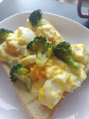 茹で卵とブロッコリーのマヨトースト 忙しい朝はトースターでマヨ焼きに限ります。一品でボリュームのある朝ごはんが出来上がります。今日はブロッコリーとゆで卵をのせて焼きました。