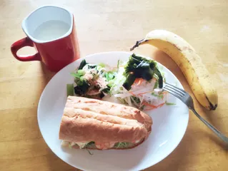 海老を電子レンジで加熱して、軽く塩コショウ。燻製マヨネーズが減塩を助けてくれます。バゲットも前より上手く焼けるようになりました。 朝食海老サンド、大根サラダ、茹で小松菜、バナナ、ホットミルク